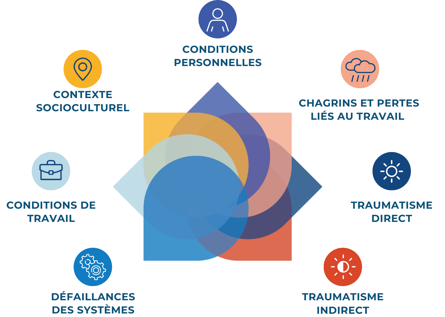 Ce cadre conceptuel renferme sept domaines de facteurs de risque : conditions personnelles, chagrins et pertes liés au travail, traumatisme direct, traumatisme indirect, défaillance des systèmes, conditions de travail et contexte socioculturel.